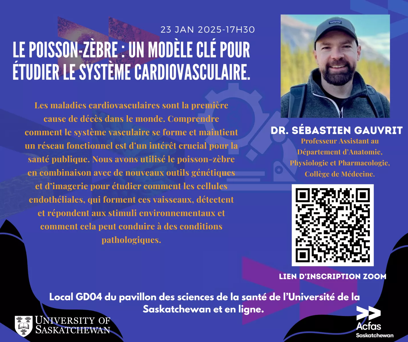 L’Acfas-Saskatchewan continue son cycle de conférences en français. La prochaine conférence, intitulée « Le poisson-zèbre : un modèle clé pour étudier le système cardiovasculaire » aura lieu le jeudi 23 janvier à 17h30 dans la salle GD04 du bâtiment Health Sciences et en Zoom. Elle sera donnée par Dr. Sebastien Gauvrit, professeur adjoint dans le département d’Anatomie, Physiologie et Pharmacologie, Collège de Médecine. Un petit goûter sera servi.