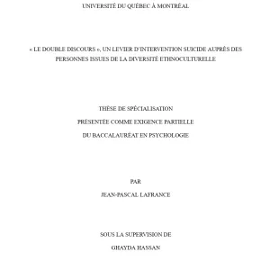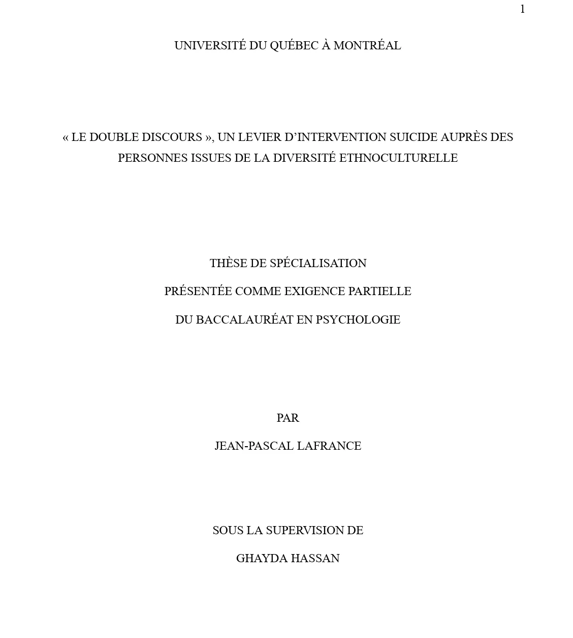 Lafrance, J-P. (2024). « Le double discours », un levier d'intervention suicide auprès des personnes issues de la diversité ethnoculturelle [thèse de spécialisation, Université du Québec à Montréal]. https://psychologie.uqam.ca/wp-content/uploads/sites/73/2024/07/LAFJ04058309_These-de-specialisation_Double-discours-suicide_VF.pdf