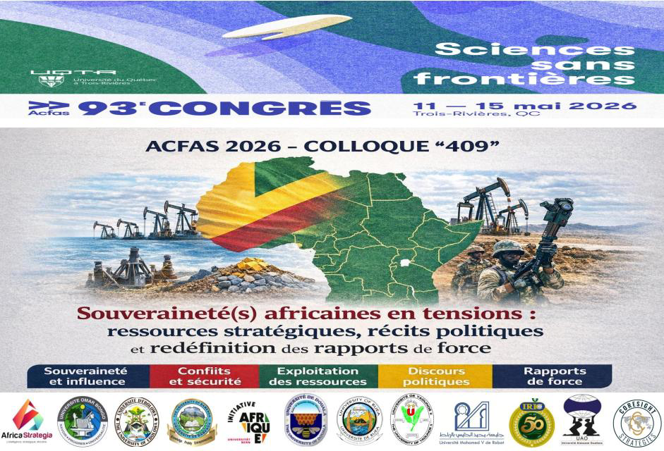 Le colloque « Souveraineté(s) africaines en tensions : ressources stratégiques, récits politiques et redéfinition des rapports de force » s'inscrit dans le cadre du 93ᵉ Congrès de l'Acfas, qui se tiendra à l'Université du Québec à Trois-Rivières en mai 2026. Il vise à analyser les formes contemporaines de la souveraineté en Afrique, entendue non comme une notion juridique figée, mais comme un ensemble de pratiques politiques, économiques et symboliques profondément reconfigurées par les rivalités internationales. Notre colloque se déroulera sur deux jours, précisément les jeudi 14 et vendredi 15 mai 2026.