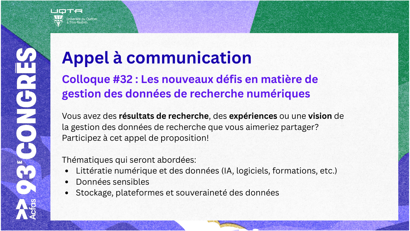 Pour faire suite au colloque de 2025 « Les nouveaux défis en matière de gestion des données de recherche sensibles au Québec », nous souhaitons avoir une discussion plus générale sur les défis rencontrés par la communauté de recherche québécoise pendant tout le cycle de vie des données de recherche numériques.