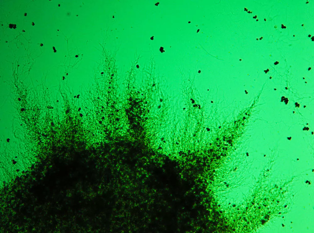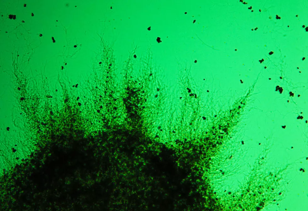 L’objectif était de produire un biopesticide avec les spores de ce champignon ; spores qui une fois germées sur les cultures deviennent les ennemies de certaines maladies du blé et de la patate. Sur l’image, on voit la forme végétative du champignon, les points noirs sont les spores formées. Mais, oh surprise! pour les chercheurs, ce bouillon contenait un antibiotique intéressant, enrichi de champignons. Après différentes procédures de raffinement, maints tâtonnements, un antibiotique, la geldanamycine, est désormais à l’étape d’essais cliniques dans des batteries médicamenteuses de traitements de certains cancers…