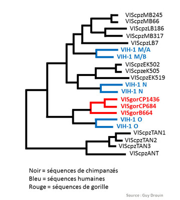 Cette hypothèse singe-humain est appuyée par l’arbre phylogénétique, situé à droite (adapté de Van Heuverswyn et coll., 2006). De plus, cet arbre, construit à partir des séquences de gènes des virus de l'immunodéficience humaine (VIH) et de virus de l'immunodéficience des simiens (VIS), démontre clairement que le VIH est apparu trois fois chez les humains.