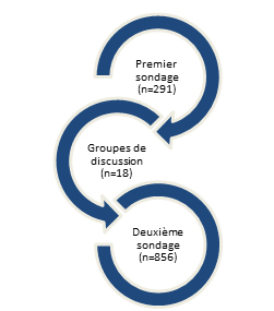 et les personnes ayant obtenu un diplôme de cycle supérieur depuis moins de cinq ans. Adoptant une démarche exploratoire, la collecte des données s’est déroulée en trois volets, chacun éclairant un pan de la thématique générale (voir Figure 1). D’abord, un premier sondage (90 questions) a été réalisé en vue d’en savoir davantage sur les aspirations professionnelles de la relève en recherche. Ensuite, des groupes de discussion semi-dirigés ont permis d’identifier des stratégies et des pistes de solution destinées à différents acteurs du milieu (université, bailleurs de fonds, employeurs, étudiantes et étudiants) pour faciliter la transition vers une carrière hors des murs de l’université. Finalement, un deuxième sondage a été mené afin d’identifier des stratégies et pistes d’action jugées prioritaires.