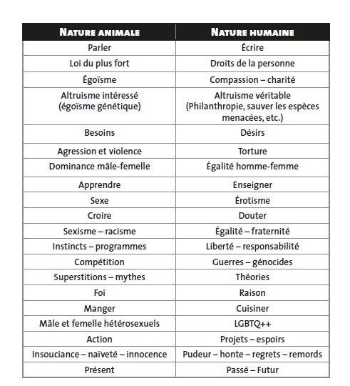 Le livre repose sur l’idée centrale que notre espèce entretient une relation unique et ambivalente avec l’évolution par sélection naturelle. Il me semble évident que, d’une part, comme toutes les autres espèces, la nôtre est le fruit de millions d’années d’évolution par sélection naturelle. Mais, d’autre part, l’espèce humaine est la seule qui, dans une large mesure, s’est émancipée des impératifs de la sélection naturelle. Nous possédons par conséquent une double nature, une nature animale héritée de notre histoire biologique évolutive et une nature humaine inventée par l’humanité elle-même (Tableau 1). Par un curieux retour des choses, la sélection naturelle nous aurait donc, par inadvertance bien sûr, dotés de l’outil qui nous a permis d’échapper à son emprise. Selon moi, l’invention clé qui a permis à notre espèce de passer de la nature animale à la nature humaine, tout en conservant la première, c’est le langage, le grand Rubicon de notre histoire dont découlent toute la culture et la civilisation.