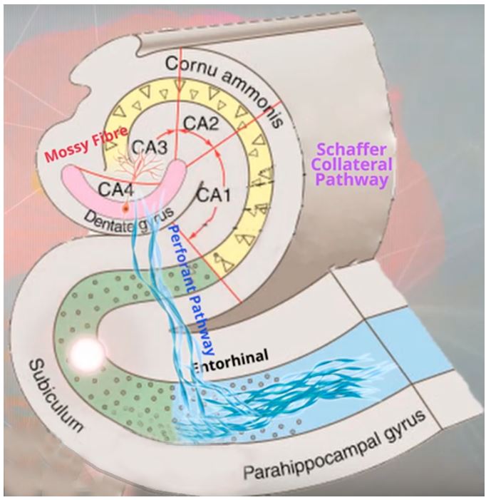 Mais encore faut-il, pour ce faire, que se produise une autre étape du processus, celle où les paquets d’informations, abouties à l’intérieur du cortex entorhinal, soient projetées dans l’ensemble de l’hippocampe. Et c’est en empruntant la zone dite « perforant pathway » (voie perforante) que cette projection est assurée.